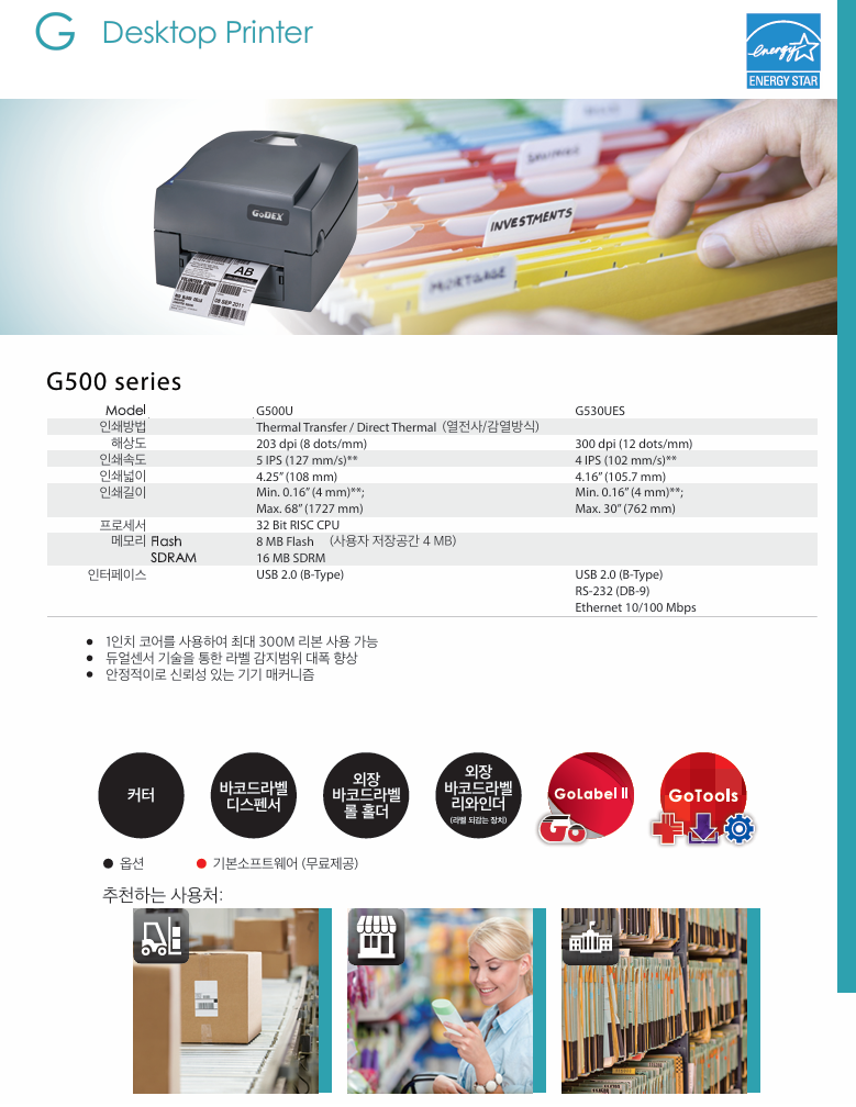 "트윈 센서 기술"을 통해 G500U는 특히 소매 및 산업 응용 분야의 모든 유형의 특수 재료에 인쇄하는 데 적합합니다