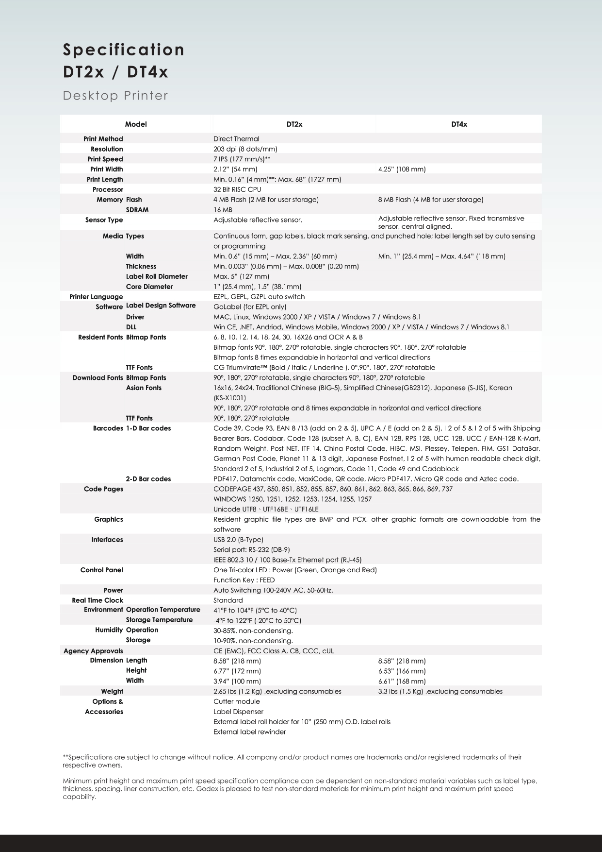 DT2x와 DT4x는 모두 초경량, 소형이어서 공간 활용도가 가장 뛰어나며 여러 통신 포트를 지원합니다. 소매, 창고, 물류 및 운송, 의료 라벨과 태그 인쇄에 효과적이고 멀티태스킹이 가능합니다.