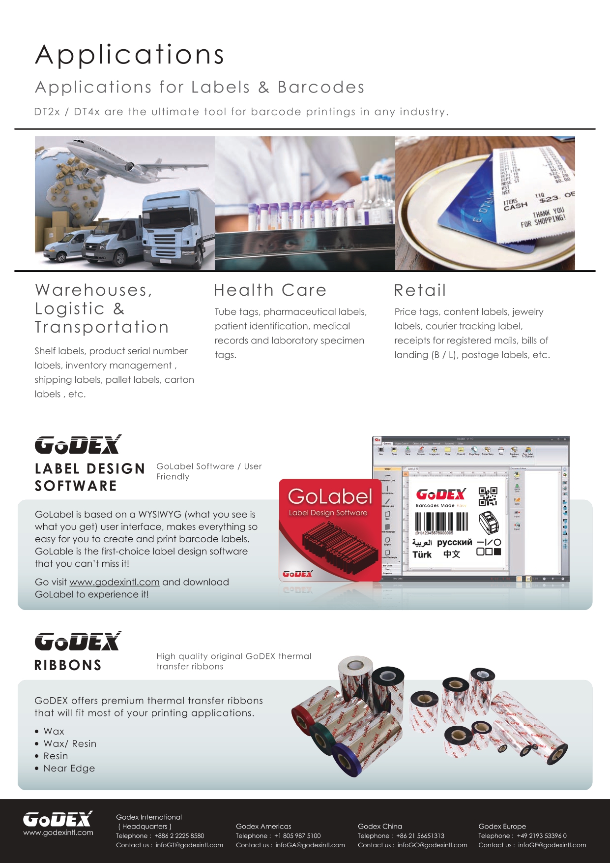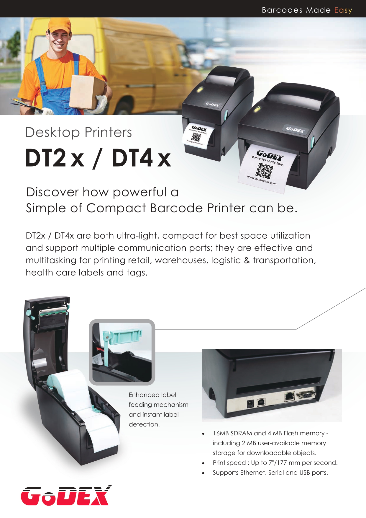 DT2x와 DT4x는 모두 초경량, 소형이어서 공간 활용도가 가장 뛰어나며 여러 통신 포트를 지원합니다. 소매, 창고, 물류 및 운송, 의료 라벨과 태그 인쇄에 효과적이고 멀티태스킹이 가능합니다.